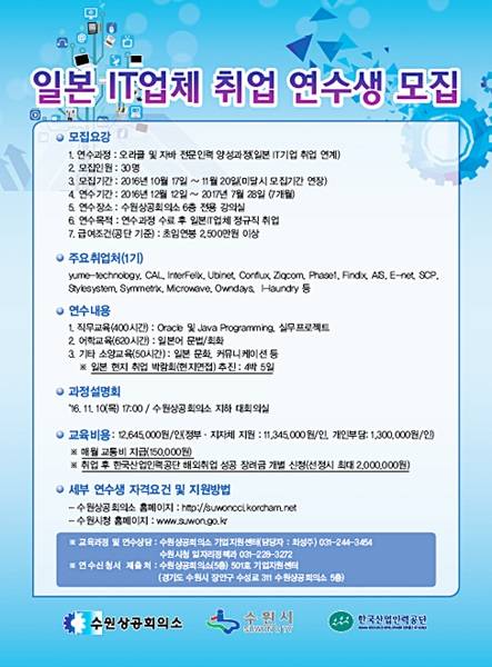 수원시와 수원상공회의소는 청년 취업준비생을 대상으로 일본 IT 기업체 정규직 취업 과정 연수생 30명을 모집한다.