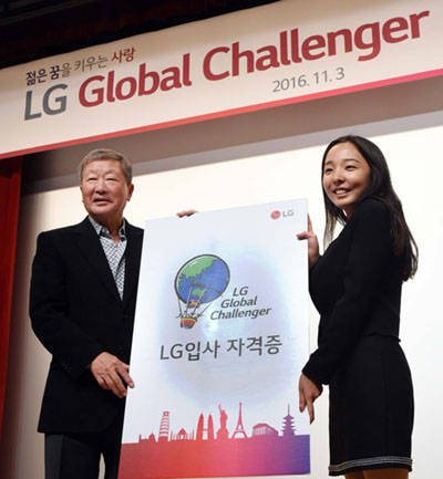구본무 LG 회장이 3일 여의도 LG트윈타워에서 열린 ‘LG글로벌챌린저’ 시상식에 참석해 창의적이고 혁신적인 도전을 마치고 돌아온 34개 팀 136명의 대학생들을 격려했다고 LG가 밝혔다.