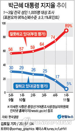 여론조사전문기관 한국갤럽이 지난 1~3일 전국의 성인남녀 1천5명을 상대로 실시한 정례 주간 여론조사 해(표본오차 95% 신뢰 수준에 ±3.1%포인트) 4일 발표한 바에 따르면 박 대통령의 국정수행에 대해 긍정적으로 평가한 응답자는 전주 17%에 비해 무려 12%p 하락한 5%로 나타난 반면 국정수행에 대한 부정적인 평가는 전주보다 15%p나 수직상승한 89%를 기록했으며, 나머지 6%는 '모름·응답 거절'로 나타났다.