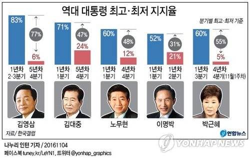 이와 관련 한국갤럽은 “과거 대통령의 직무 긍정률 최고치와 최저치 기록은 모두 김영삼 전 대통령으로, 1년차 2,3분기에 83%에 달했으나 'IMF 외환위기'를 맞았던 5년차 4분기에 6%로 하락했다”면서 “이번 조사에서 나타난 박 대통령 직무 긍정률은 역대 대통령 최저치를 경신한 것”이라고 설명했다.