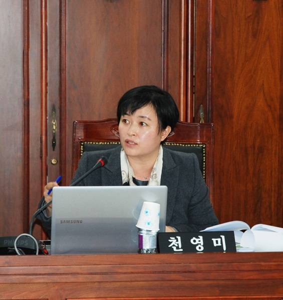 천영미 의원(더민주당)은 납품실적(400~1000대)의 평가기준 반영 여부에 대해 질의하고 경기도에서 제출한 자료와 버스조합이 말하는 기준표가 다르다는 점을 지적했다. 또한 천 의원은 평가결과 집계표 공개를 강하게 주장하며 “경기도는 돈만 주고 아무런 자료도 아무런 권한도 감독도 하지 않는다는 것은 심각한 문제”라며 입찰과정에 대한 경기도의 역할 부재를 강하게 질타했다.