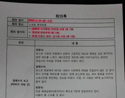 같은 회의록에는 포스코도 거명된다. 정 전 사무총장은 황은영 포스코 사장을 만나 포스코가 배드민턴단을 창단해 줄 것을 요구했다. K스포츠를 통해 대기업 스포츠단들을 관장하고 이를 구실로 협찬이나 기금 등을 요구하려 했던 것으로 짐작된다.