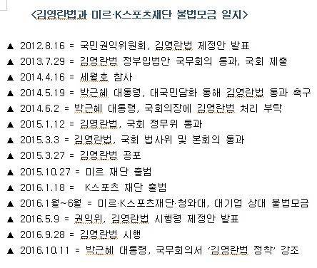 최씨 일당의 모금 시기는 김영란법이 제정된 이후다. 미르 재단은 지난해 10월, K스포츠 재단은 올해 1월 각각 출범했으며 이 직후부터 기업들에 대한 강제 출자가 시작됐다. 김영란법은 지난해 3월 공포된 후 18개월 간의 유예기간을 거쳐 9월 28일부터 시행됐다. 최씨 일당은 유예기간에 법을 위반했으므로 이 법으로 처벌 받지는 않는다. 최씨와 안 전 수석 등은 직권남용과 강요죄 등의 혐의를 받고 있다.