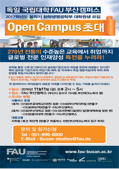한편 신입생 모집기간을 맞아 FAU 부산캠퍼스에서 11월 11일 오후 2시부터 5시까지 오픈캠퍼스 행사를 개최한다. 입시설명은 물론, 캠퍼스투어, 연구소투어, 졸업생, 독일본교 교환학생 및 재학생들과의 대화, 독일 교수와 개별상담, 기념품 및 독일식 맥주와 다과가 준비돼 있다. 이번 행사를 통해 독일공학교육시스템과 프로그램 등을 엿볼 수 있으며, 입학과 관련된 다양한 정보를 얻을 수 있다.