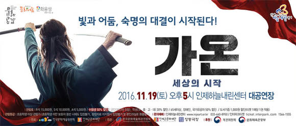 또 19일 오후 5시 판소리와 한국무용, 미디어아트를 결합해 연극성과 음악성을 갖춘 한국적 영웅 판타지를 그린 전통창작공연인 '가온-세상의 시작'이 하늘내린센터 대공연장에서 열린다.
