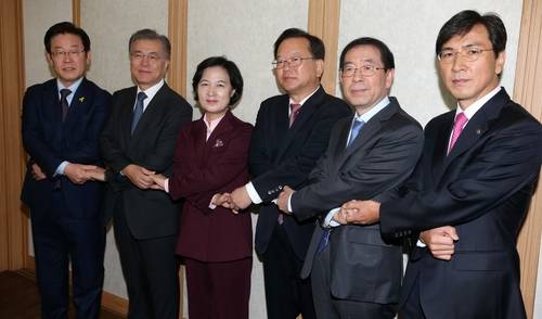 ▲8일 오전 서울 여의도의 한 식당에서 열린 더불어민주당 추미애 대표와 대선 예비주자의 '최순실 게이트' 관련 정국 상황논의 모임에서 참석자들이 손을 맞잡고 있다. 왼쪽부터 이재명 성남시장, 문재인 전 대표, 추미애 대표, 김부겸 의원, 박원순 서울시장, 안희정 충남지사.(사진=연합뉴스)