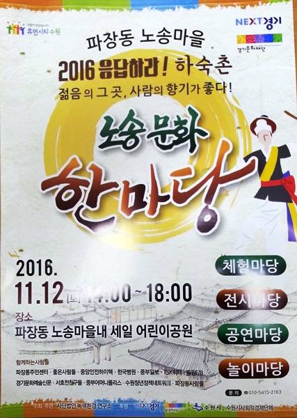오는 12일 오후 2시부터 수원 파장동 노송마을 내 세일 어린이공원에서 '2016응답하라!하숙촌'이라는 주제로 체험마당과 전시, 공연,놀이마당 등이 개최된다.