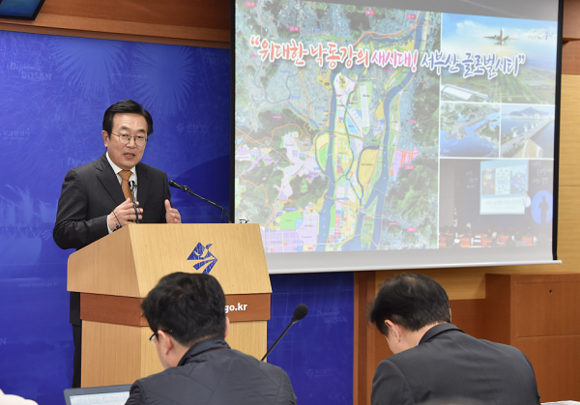 서병수 부산시장이 8일 오후 1시 20분 시청 9층 브리핑룸에서 기자회견을 열고, 서부산권 균형발전 주요 프로젝트를 발표했다.