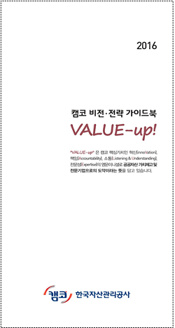 한국자산관리공사(캠코)는 8일 새로운 기업문화 기반 마련을 위해 기업 가치체계 해설서인 '캠코 비전·전략 가이드북 VALUE-up!'을 발간했다.