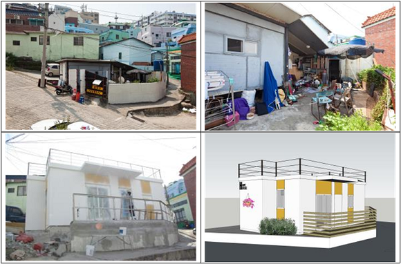 ▲'HOPE with HUG' 프로젝트를 통해 새롭게 거듭난 부산 감만동의 홀몸어르신 주택(상단: 시공전, 하단: 시공사진 및 조감도)
