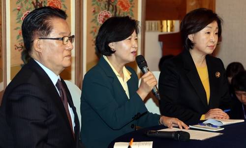 ▲더불어민주당 추미애 대표(가운데)가 9일 국회 사랑재에서 열린 야3당 대표 회담에서 입장을 밝히고 있다. 왼쪽은 국민의당 박지원 비상대책위원장. 오른쪽은 정의당 심상정 대표.(사진=연합뉴스)