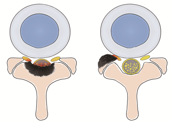 ▲척추관협착증(왼쪽)과 신경공협착증(오른쪽)으로 검게 표시된 부분이 신경을 누르는 부위다.
