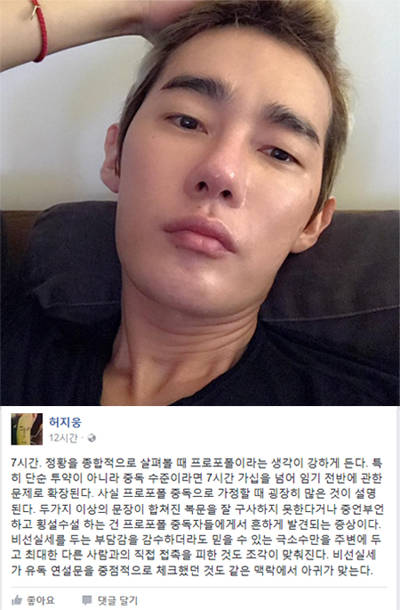9일 허지웅은 자신의 페이스북에 “7시간. 정황을 종합적으로 살펴볼 때 프로포폴이라는 생각이 강하게 든다. 특히 단순 투약이 아니라 중독 수준이라면 7시간 가십을 넘어 임기 전반에 관한 문제로 확장된다”라는 글을 올렸다.