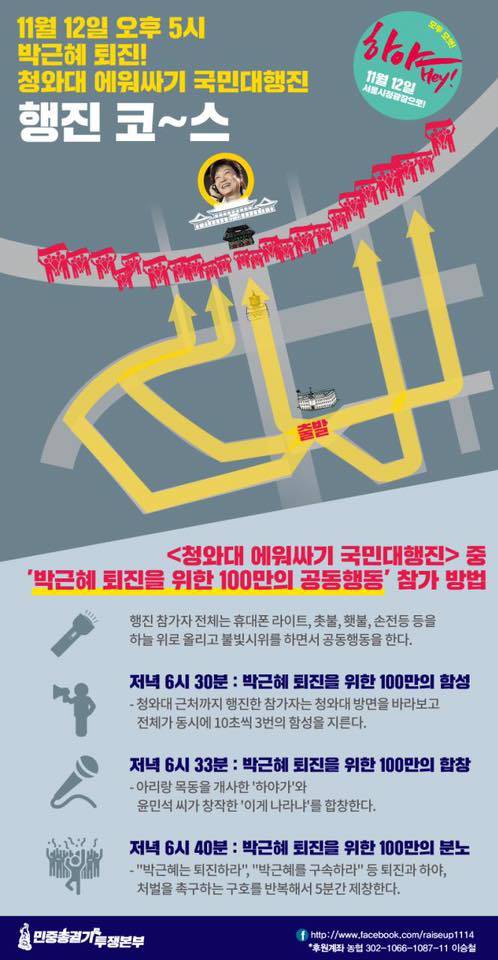 그러면서 주최 측은 “행진을 하면서 오후 6시 30분부터는 ‘박근혜 퇴진을 위한 공동행동’이 진행되며 불빛시위를 시작으로 함성, 합창, 분노를 집단적으로 표현하는 방식”이라며, 청와대를 둘러싼 시민들이 청와대 안에 있을 박 대통령이 들을 수 있게끔 함성과 합창을 할 것임을 분명히 했다.
