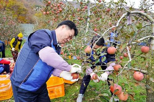 현대자동차 울산공장 임직원들은 10일 울산 울주군 상북면 소호마을에서 사과수확 농촌봉사활동을 펼쳤다.
