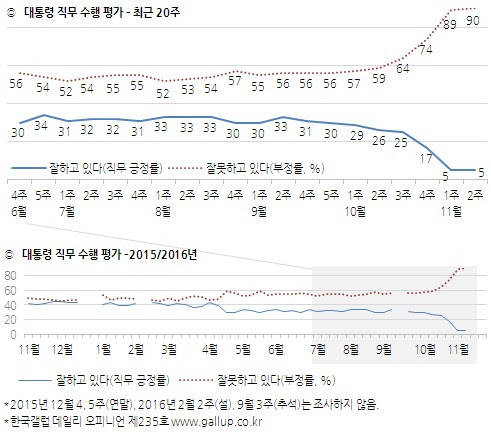 여론조사전문기관인 한국갤럽이 지난 8~10일 전국 성인 1003명을 대상으로 조사해 11일 발표한 11월 2주차 박근혜 대통령에 대한 조사에 따르면 ‘대통령으로서의 직무를 잘 수행하고 있다고 보는지’ 질문한 결과, 긍정 평가는 지난 주와 마찬가지로 역대 대통령 최저치인 5%를 유지한 것으로 조사됐으며, 부정 평가는 지난 주보다 1%p 상승한 90%로 역대 최고치를 기록했고. 4%는 의견을 유보했다(어느 쪽도 아님 1%, 모름/응답거절 3%).