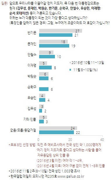 매달 실시되는 차기대선후보 지지도 조사에서는 반기문 유엔 사무총장 6%p 급락했으나 21%로 선두를 고수했고, 민주당 문재인 전 대표와 국민의당 안철수 전 대표는 각각 1%p 상승해 19%, 10%로 2~3위를 유지했다.