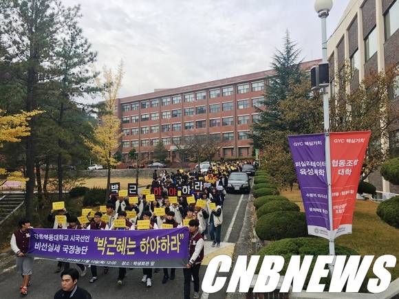 강릉영동대 재학생 500여명은 지난 10일 오후 12시 본관 앞에서부터 학교 주변을 행진하며 대통령 하야와 최순실 게이트 진상 규명을 촉구하는 시국선언을 했다. 또 재학생 500명의 서명을 담아 새누리당 권성동 국회의원 사무실에 전달했다.