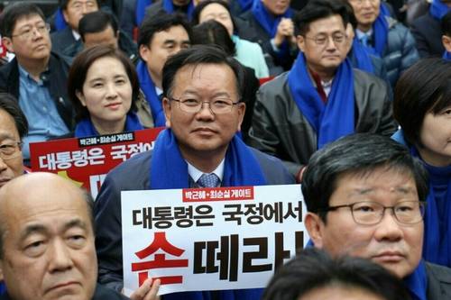 ▲더불어민주당 김부겸 의원(가운데)이 12일 오후 서울 종로구 청계광장에서 열린 더불어민주당 박근혜-최순실 게이트 규탄대회에 참가하고 있다.(사진=김부겸의원실 제공)