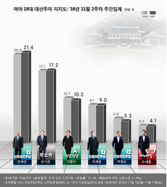 민주당 문 전 대표는 지난주 대비 0.5%p 오른 21.4%, 3주 연속 상승세를 이어가며 반기문 사무총장을 조사 이래 처음으로 오차범위(±1.9%p) 밖에서 앞서며 2주 연속 1위를 차지했으며, 반 총장은 0.1%p 오른 17.2%로 지난 3주 동안의 하락세가 멈췄으나 문 전 대표에 조사 이래 처음으로 오차범위(±1.9%p) 밖으로 뒤지며 2주 연속 2위에 머물렀다.