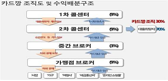 경기남부경찰청 지능범죄수사대는 급전이 필요한 사람들에게 전화해 금융기관을 사칭, "신용에 관계없이 카드 한도 내에서 대출이 가능하다"고 유인한 후 신용카드 정보를 받아낸 뒤 자신들이 개설·관리하는 유령 카드가맹점에서 허위 결제하고 수수료 명목으로 30%를 제한뒤 금액을 대출금으로 지급한 카드깡 조직 55명을 검거해 이중 콜센터 운영자 박 모(43세,남)씨와 중간브로커 최 모(66세,남)씨, 가맹점 브로커 이 모(75세,남)씨 등 7명을 구속하는 한편 콜센터 상담원 하 모(42세,여)씨, 유령법인대표 유 모(38세,남)씨 등 48명을 형사입건했다.