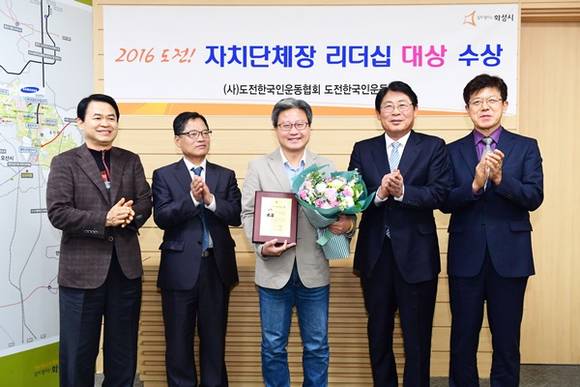 채인석 화성시장이 2016 도전 자치단체장·지역축제 대상에서 리더십(지역활성화 부문) 대상을 수상하고 15일 접견실에서 전달식을 가졌다.