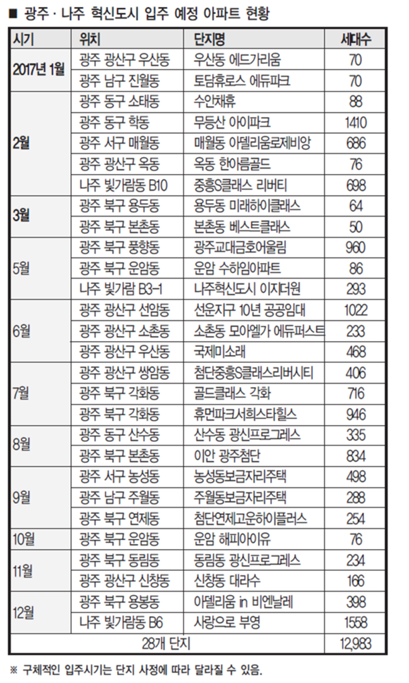 광주지역 부동산 전문 사이트 사랑방 부동산(srbhome.co.kr)이 2017년 한해 동안 광주와 나주 혁신도시에서 입주 예정인 아파트를 조사한 결과, 28개 단지에서 1만2983세대가 집들이를 하는 것으로 나타났다.