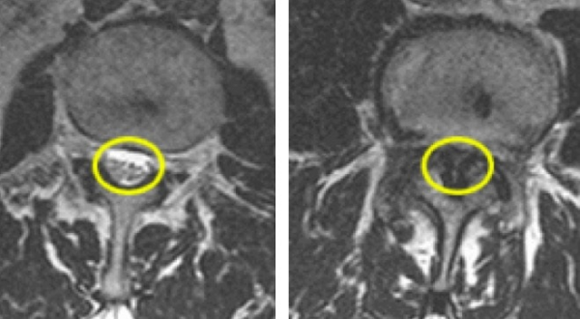 ▲정상 척추(좌)와 척추관협착증 환자의 척추(우) 모습. 오른쪽 사진의 표시 부위를 보면 두꺼워진 인대(검은 부분)와 관절을 확인할 수 있다.