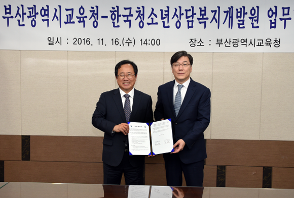 부산시교육청은 16일 오후 2시 교육감실에서 한국청소년상담복지개발원과 위기청소년 대상 심리상담 지원을 위한 업무협약을 체결했다.