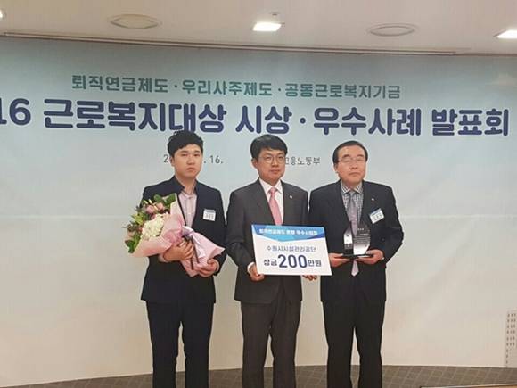 ▲16일 수원시시설관리공단이 서울지방고용노동청에서 열린 퇴직연금제도 운영 우수사례 공모전 시상식에서 장관상을 수상했다.사진 왼쪽부터 김태진 공단 홍보 주임, 고영선 고용노동부 차관, 김원식 공단 경영사업본부장(사진=수원시시설관리공단)