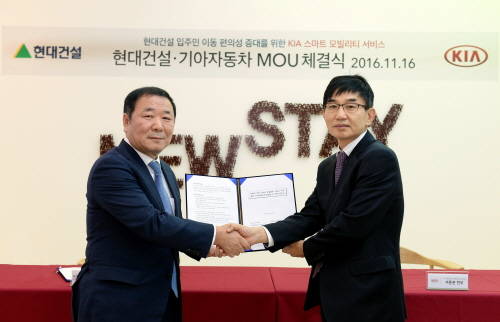 기아차는 16일 경기도 수원시 권선구에 위치한 ‘힐스테이트 호매실’ 견본 주택에서 서춘관 기아차 전무, 장건식 현대건설 상무가 참석한 가운데 ‘기아 스마트 모빌리티 서비스’ MOU 체결식을 진행했다.