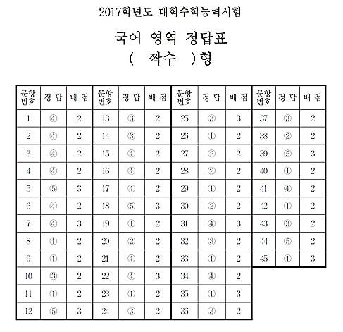 2017년 대학수학능력시험 과목별 정답표가 공개되는 가운데 국어 영역 짝수형 정답표가 화제다. 이유는 정답이 연속으로 같은 숫자가 나왔기 때문.