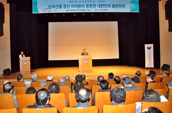 부산지방보훈청(청장 전홍범)은 17일 부산시민회관 소극장에서 일제에 침탈당한 국권상실의 역사적 교훈을 되새기고, 대일 항쟁기에 국권회복을 위해 항거하다 순국하신 선열들의 위훈을 기리는 '제77회 순국선열의 날 기념식'을 가졌다.