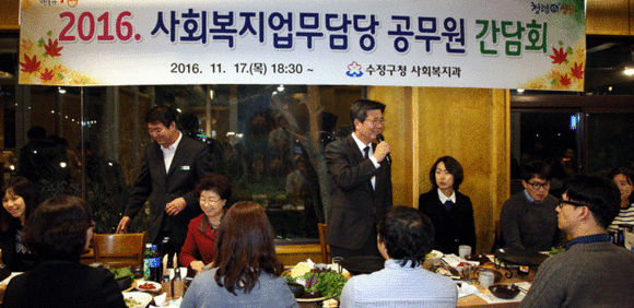 날씨가 추워지면서 소외계층과 복지사각지대에 있는 노인층들의 대한 과도한 업무가 예상되고 있는 가운데, 성남시 수정구청이 일선에서 복지업무를 담당하고 있는 사회복지담당 공무원을 대상으로 간담회를 개최했다고 18일 밝혔다.