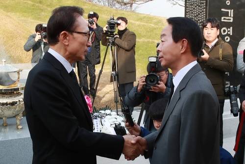 ▲이명박 전 대통령(왼쪽)이 고(故) 김영삼 전 대통령 서거 1주기를 하루 앞둔 21일 오후 서울 동작구 국립서울현충원에서 김 전 대통령 묘소를 참배한 뒤 김 전 대통령의 차남 김현철 고려대 지속발전연구소 연구교수와 악수하고 있다.(사진=연합뉴스)