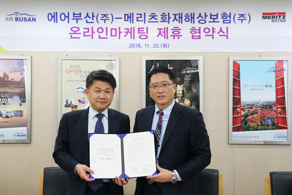 에어부산(사장 한태근)은 22일 오후 메리츠화재해상보험과 여행자 보험과 관련한 온라인 마케팅 제휴 협약을 체결했다.