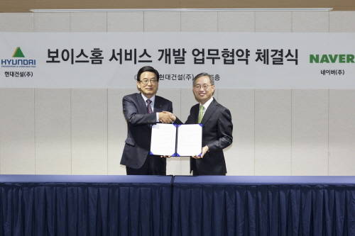 현대건설은 네이버와 지난 21일 서울시 종로구 계동 현대건설 본사에서 정수현 사장과 네이버 김상헌 사장 등이 참석한 가운데, 음성만으로 가정일을 쉽게 해결할 수 있는 공동주택 음성인식 서비스인 ‘보이스 홈 서비스 개발’ 업무협약을 체결했다.