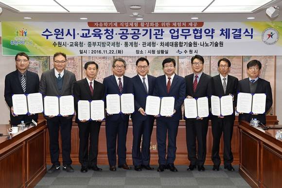 자유학기제 시행에 따른 청소년 진로·직업 체험, 진로교육 활성화를 목적으로 하는 이번 협약에는 수원시, 수원교육지원청을 비롯해 수원세무서, 동수원세무서, 경인지방통계청 수원사무소, 수원세관, 차세대융합기술연구구원, 한국나노기술원 등 8개 기관이 참여했다.