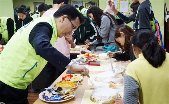 ▲HUG 조재훈 상근감사위원이 보육원 아이들과 케잌을 만들고 있다. (사진=HUG)