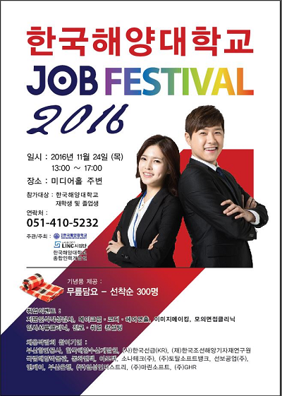 한국해양대학교(총장 박한일)는 오는 24~25일 학내 일원에서 재학생 및 졸업생들을 대상으로 '잡 페스티벌(JOB FESTIVAL)'을 개최한다고 23일 밝혔다.