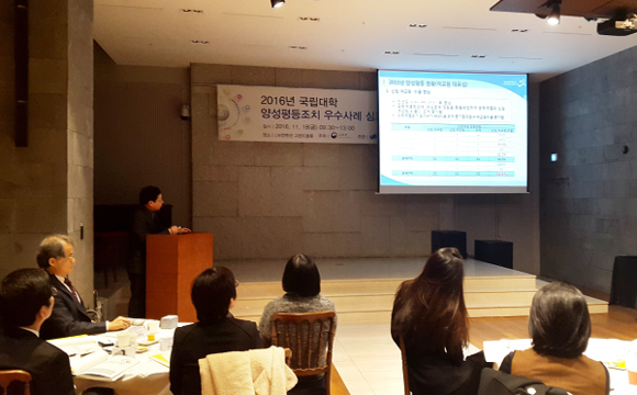 ▲부산대 김남득 교무처장이 지난 18일 열린 '2016년 국립대학 양성평등조치 우수사례 심포지엄'에서 우수사례를 발표하고 있다. (사진=부산대)