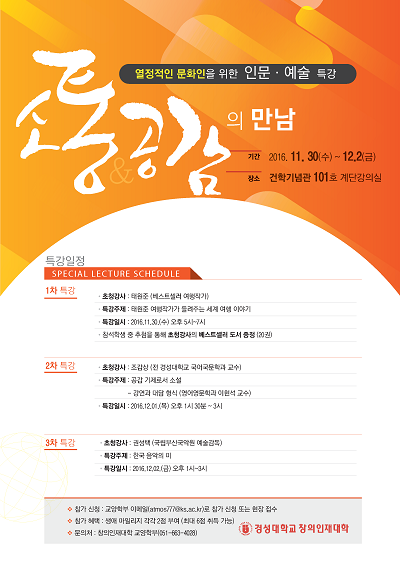 창의인재대학이 주최하는 인문·예술 특강은 '열정적인 문화인'이라는 경성대의 인재상을 실현하기 위해 마련됐다. 학생들에게 다양한 장르의 대중예술을 접할 수 있는 기회를 제공하여 인간과 사회를 이해할 수 있는 공감 역량과 정서적으로 자기를 조절할 수 있는 자기관리 능력을 고양시키기 위해 오는 30일부터 12월 2일까지 건학기념관 101호에서 세 차례에 걸쳐 진행된다.
