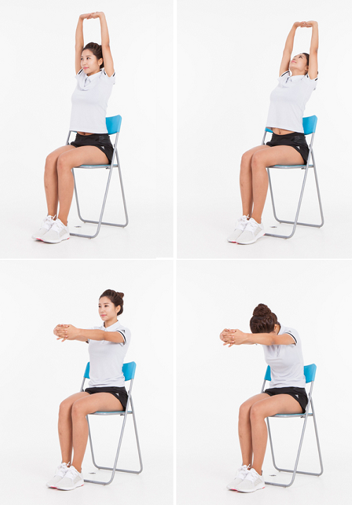 ▲기립근 늘이기(사진 위쪽 좌→우), 등근육 펴기(아래쪽) 등 술도 깨고 척추도 펴는 간단 스트레칭법.