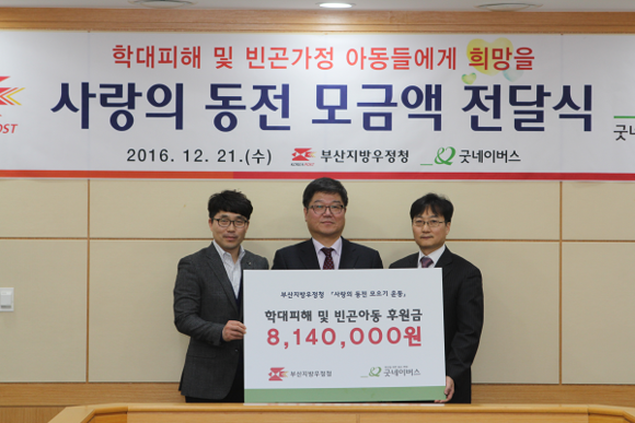 부산지방우정청(청장 정한근)은 지난 5월부터 부산·울산·경남지역 우체국과 취급국을 통해 사랑의 동전 814만원을 모금해 굿네이버스에 부산우정청 소회의실에서 모금액을 전달했다.
