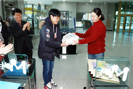 과학체험관은 이날 5만번째 입장한 반안중 3학년 한민호 학생에게 기념품을 전달하는 행사를 가졌다.