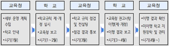 먼저 1단계에서 시교육청이 제·개정이 필요한 학칙에 대해 권고를 한다. 2단계에서 일선학교가 학칙을 제·개정한 후 시교육청에 보고하면 전문가로 구성된 컨설팅단에서 이를 점검해 문제가 있는 부분을 수정할 것을 다시 권고한다.