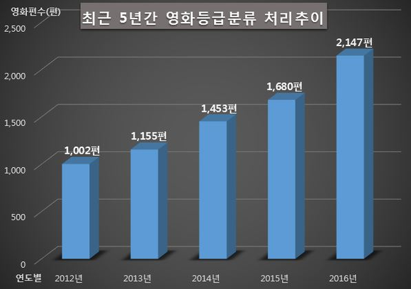 영등위 집계에 따르면, 2016년 등급분류된 영화 편수는 총 2147편에 달했다. 이는 `12년 1002편의 영화가 처리되어 등급분류 편수가 1000편을 넘은 지 4년 만에 2배 이상(1145편) 증가한 것이다.