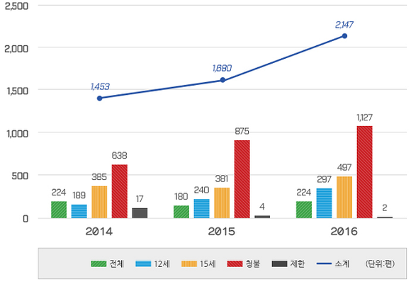 지난해 영화 등급분류 편수 증가세는 어느 해보다 확연했다. 최근 5년 간 등급분류 추이를 보면 `12년 1002편, `13년 1155편, `14년 1453편, `15년 1680편 등 매년 평균 170편이 늘어나 완만한 증가세를 보였으나, 지난해에는 467편이 늘어나 2015년 대비 27.8%가 증가한 것으로 집계됐다.