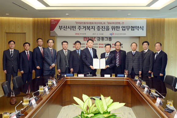 BNK금융그룹(회장 성세환) 부산은행이 14일 한국공인중개사협회 부산지부와 '부산시민 주거복지 증진을 위한 업무협약'을 체결했다.