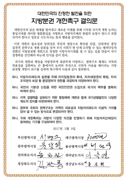영·호남 시·도지사협력회의 의장인 서병수 부산시장은 지난 8일 기자회견을 통해 지방분권형 헌법 개정을 강력히 주장한 바 있으며, 9일 전남 여수에서 개최된 영·호남 시·도지사협력회의에서 긴급 안건으로 '지방분권 개헌촉구 결의문'을 건의·채택, 국회 헌법개정특별위원회, 지방 4대협의체(대한민국시도지사협의회, 전국시장군수구청장협의회, 전국시도의회의장협의회, 전국시군자치구의회의장협의회), 여야 4당(자유한국당, 바른정당, 국민의당, 더불어민주당)에 전달한 바 있다.